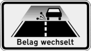 | 20:50, 27. Dez. 2014 | VzFSBZZBelag.svg (Datei) | 38 KB | Fuchsisches Verkehrszeichen "Belag wechselt" | 1 | |