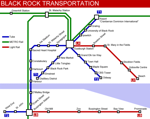 Neben dem bedeutensten Bahnhof "Outsburgh Station" exisitieren noch eine Reihe weiterer Personen- und Güterbahnhöfe in Black Rock. Der Cranberran Lumantic hält auf seiner Fahrt zwischen Lythwater und Oustburgh in Black Rock und mehrere Strecken der METRO Rail kreuzen sich hier. In Black Rock besteht ein modernes und gut ausgebautes U-Bahn-Netz. Auf zwei der stillgelegten Straßenbahnstrecken verkehren jetzt moderne Dieseltriebzüge in die Vorstädte. Der Flughafen "Cranberrian Dominion International" ist der größte des Landes. Von hier verkehren Fluglinien in alle Welt. Er ist auch der Hauptstützpunkt der "Air Cranberra".